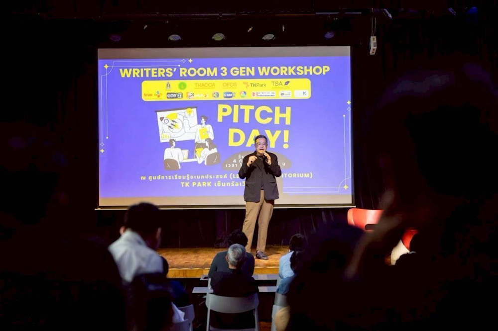 หลังจากเปิดโปรเจ็กต์สุดสร้างสรรค์ เพื่อพัฒนานักเขียนบทไทย 3 เจเนอเรชั่น ให้สามารถเดินหน้าผลิตผลงานได้อย่างน่าสนใจและส่งเสริมการพัฒนาคอนเทนต์ไทยให้แข่งขันได้ในตลาดโลกเมื่อเดือนมิถุนายนที่ผ่านมา โครงการ “Writers’ Room 3 Gen Workshop” ซึ่งสมาคมนักเขียนบทละครโทรทัศน์ (TSA) ร่วมกับพันธมิตรทั้งภาครัฐและเอกชน อาทิ กรมส่งเสริมวัฒนธรรม กระทรวงวัฒนธรรม, THACCA สำนักงานส่งเสริมวัฒนธรรมสร้างสรรค์, OFOS – One Family One Soft Power, อุทยานการเรียนรู้ TK Park, True CJ Creation, ช่อง One31, ช่อง 3, ช่อง 7HD, GMMTV, MONOMAX ฯลฯ จัดขึ้น ได้เดินทางมาถึงโค้งสุดท้ายแล้ว กับกิจกรรม “Pitch Day” เปิดเวทีแห่งโอกาสให้นักเขียนบทรุ่นใหม่ที่ผ่านเข้ารอบสุดท้าย ได้นำเสนอไอเดียต่อสถานีโทรทัศน์ สตูดิโอผู้ผลิตชั้นนำ และแพลตฟอร์มสตรีมมิ่งต่างๆ เมื่อวันที่ 3 กันยายน 2568 ณ ศูนย์การเรียนรู้อเนกประสงค์ (Learning Auditorium) TK Park ชั้น 8 เซ็นทรัลเวิลด์