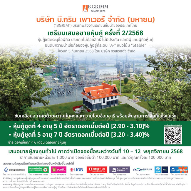บริษัท บี.กริม เพาเวอร์ จำกัด (มหาชน) หรือ BGRIM เตรียมเสนอขายหุ้นกู้ชนิดระบุชื่อผู้ถือ ประเภทไม่ด้อยสิทธิ ไม่มีประกัน และมีผู้แทนผู้ถือหุ้นกู้ ครั้งที่ 2/2568 อายุ 5 – 7 ปี ต่อประชาชนเป็นการทั่วไป (ผู้ลงทุนทั่วไป และ/หรือผู้ฃงทุนสถาบัน) และ Blue Bond หรือ หุ้นกู้สีฟ้า อายุ 3 – 10 ปี ต่อผู้ลงทุนสถาบัน และ/หรือผู้ลงทุนรายใหญ่