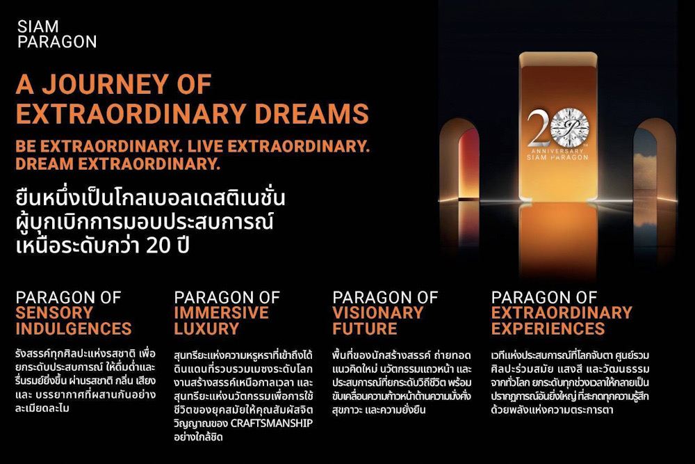“ ตลอดสองทศวรรษที่ผ่านมา สยามพารากอนเป็นจุดหมายปลายทางระดับโลกที่มีผู้คนจากทั่วโลก มาเยือนมากที่สุดแห่งหนึ่ง และวันนี้กำลังก้าวสู่ทศวรรษใหม่ด้วยแบรนด์ไอเดนทิตี Be Extraordinary • Live Extraordinary • Dream Extraordinary โดย Be Extraordinary คือเป็นตัวเองให้พิเศษ Live Extraordinary ใช้ชีวิตเหนือความคาดหมาย และ Dream Extraordinary ฝันให้ไกลกว่าที่เคย ซึ่งตอกย้ำบทบาทของสยามพารากอนในการเป็น “Pioneering the Extraordinary” ผู้บุกเบิกประสบการณ์ที่เหนือความคาดหมายอย่างแท้จริง”