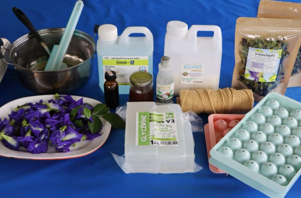ภาพที่ 1 วัสดุอุปกรณ์ในการทำสบู่ไบโอชาดอกไม้ ต.ธารทอง อ.พาน จ.เชียงราย