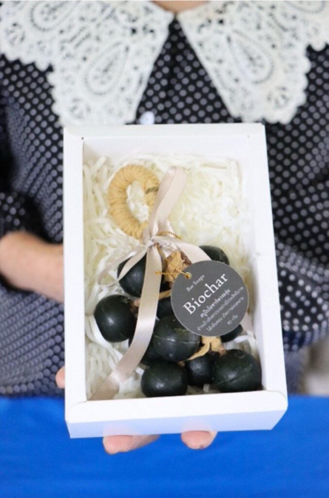 ผลผลิตจากไม้ดอกไม้ประดับดังกล่าวสามารถนำไปพัฒนาและต่อยอดเป็นผลิตภัณฑ์เพิ่มมูลค่า โดยหนึ่งในผลิตภัณฑ์ที่ได้รับความสนใจ คือ สบู่ไบโอชาร์พวงองุ่น ซึ่งพัฒนาโดยการใช้ประโยชน์จากเศษพืชเหลือใช้ผสมผสานกับสารสกัดสีและกลิ่นจากดอกไม้ที่เกษตรกรปลูกในพื้นที่ ทั้งยังมีการ ร่วมพัฒนาสูตรและออกแบบบรรจุภัณฑ์ เพื่อให้ได้ผลิตภัณฑ์ที่มีมาตรฐาน เหมาะสมต่อการจำหน่าย และเพิ่มศักยภาพทางการตลาดให้แก่ชุมชนท้องถิ่น อันเป็นการสร้างช่องทางรายได้ใหม่ ควบคู่กับการลดปริมาณของเสียทางการเกษตรที่เดิมอาจถูกกำจัดด้วยการเผา