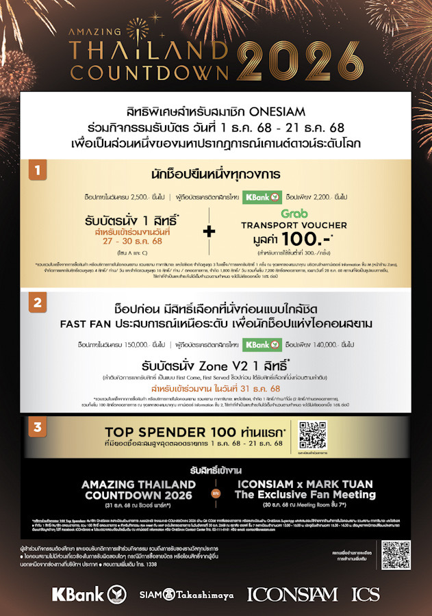 ทั้งนี้แคมเปญ AMAZING THAILAND COUNTDOWN 2026 มอบสิทธิพิเศษสำหรับลูกค้าไอคอนสยามและธนาคารกสิกรไทย ผู้เป็นสมาชิก ONESIAM รับสิทธิ์ร่วมโมเมนต์ระดับโลกในงาน Amazing Thailand Countdown 2026 ฟรี! ผ่านการสะสมยอดใช้จ่ายในไอคอนสยาม, สยาม ทาคาชิมายะ และไอซีเอส ระหว่างวันที่ 1-21 ธันวาคม 2568 โดย